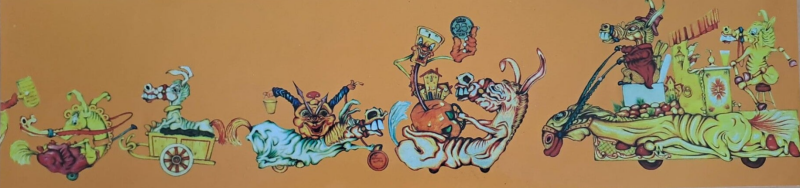 Dit jaar werd Fons Gielis bereid gevonden om een ontwerp voor ons te maken. Omdat de poppen en figuren ieder jaar groter werden, zo ook de marionetten in het ontwerp van dit jaar, werd er besloten om een een negatief te bouwen. Er werden gipsen mallen gemaakt en die mallen werden vervolgens gepolyesterd. Het stonk verschrikkelijk bij ons binnen, maar we hebben ze wel gemaakt. We bouwden in dit jaar nog boven op zolder achter op de Kaai.